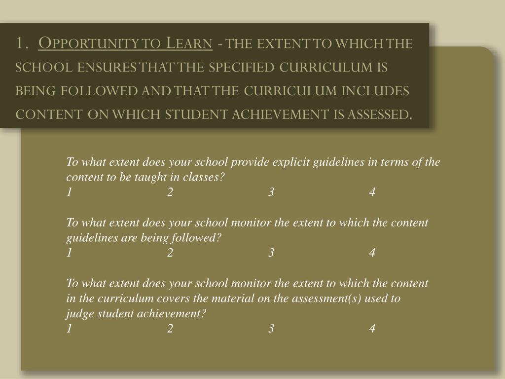 1. Opportunity to Learn - the extent to which the school ensures that the specified curriculum isbeing followed and that the curriculum includescontent on which student achievement is assessed. To what extent does your school provide explicit guidelines in terms of the content to be taught in classes? 1 2 3 4 To what extent does your school monitor the extent to which the content guidelines are being followed? 1 2 3 4 To what extent does your school monitor the extent to which the content in the curriculum covers the material on the assessment(s) used to judge student achievement? 1 2 3 4