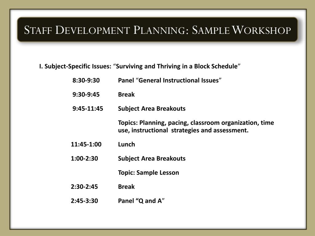 Staff Development Planning: Sample Workshop I. Subject-Specific Issues: “Surviving and Thriving in a Block Schedule” 8:30-9:30 Panel “General Instructional Issues” 9:30-9:45 Break 9:45-11:45 Subject Area Breakouts Topics: Planning, pacing, classroom organization, time use, instructional strategies and assessment. 11:45-1:00 Lunch 1:00-2:30 Subject Area Breakouts Topic: Sample Lesson 2:30-2:45 Break 2:45-3:30 Panel “Q and A”