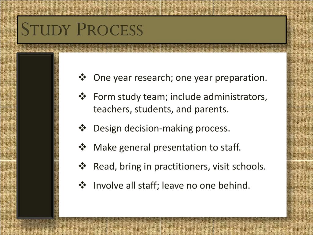 Study Process • One year research; one year preparation. • Form study team; include administrators, teachers, students, and parents. • Design decision-making process. • Make general presentation to staff. • Read, bring in practitioners, visit schools. • Involve all staff; leave no one behind.