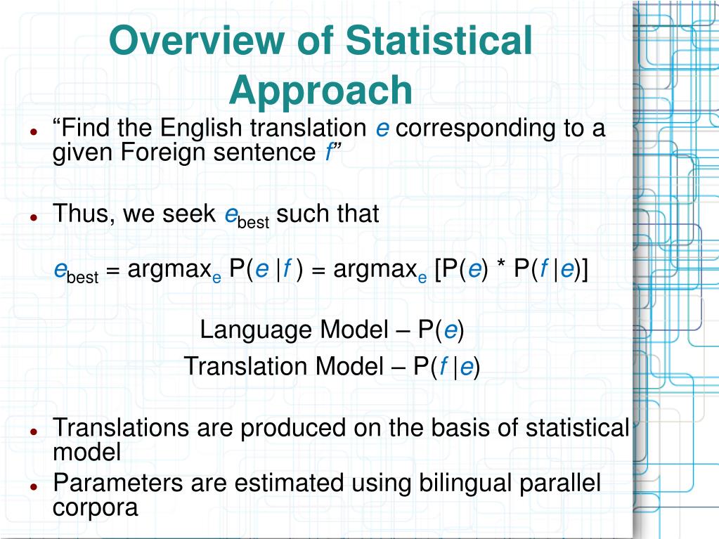 Overview of Statistical Approach • “Find the English translation e corresponding to a given Foreign sentence f” • Thus, we seek ebest such that ebest = argmaxe P(e |f ) = argmaxe [P(e) * P(f |e)] Language Model – P(e) Translation Model – P(f |e) • Translations are produced on the basis of statistical model • Parameters are estimated using bilingual parallel corpora