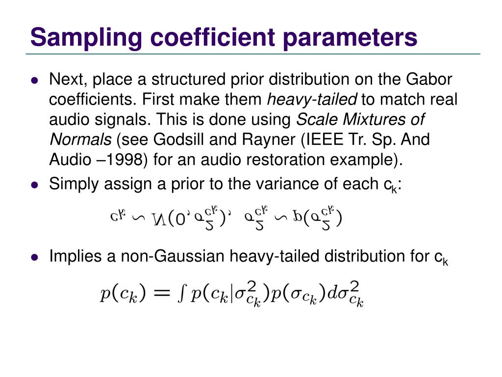 Sampling coefficient parameters • Next, place a structured prior distribution on the Gabor coefficients. First make them heavy-tailed to match real audio signals. This is done using Scale Mixtures of Normals (see Godsill and Rayner (IEEE Tr. Sp. And Audio –1998) for an audio restoration example). • Simply assign a prior to the variance of each ck: • Implies a non-Gaussian heavy-tailed distribution for ck