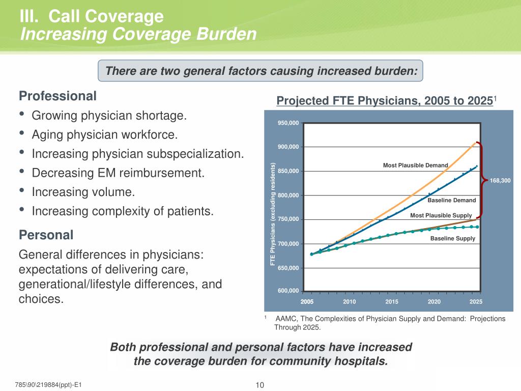 III. Call CoverageIncreasing Coverage Burden There are two general factors causing increased burden: Professional • Growing physician shortage. • Aging physician workforce. • Increasing physician subspecialization. • Decreasing EM reimbursement. • Increasing volume. • Increasing complexity of patients. Personal General differences in physicians: expectations of delivering care, generational/lifestyle differences, and choices. Projected FTE Physicians, 2005 to 20251 950,000 900,000 Most Plausible Demand 850,000 168,300 800,000 Baseline Demand FTE Physicians (excluding residents) Most Plausible Supply 750,000 • • • • • • • • • • • • • • • Baseline Supply • • 700,000 • • • • 650,000 600,000 2005 2005 2010 2015 2020 2025 1 AAMC, The Complexities of Physician Supply and Demand: Projections Through 2025. Both professional and personal factors have increased the coverage burden for community hospitals. 785\90\219884(ppt)-E1