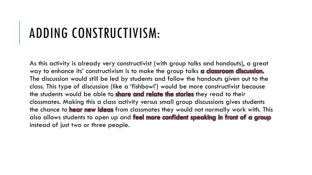 ADDING constructivism: • As this activity is already very constructivist (with group talks and handouts), a great way to enhance its’ constructivism is to make the group talks a classroom discussion. The discussion would still be led by students and follow the handouts given out to the class. This type of discussion (like a ‘fishbowl’) would be more constructivist because the students would be able to share and relate the stories they read to their classmates. Making this a class activity versus small group discussions gives students the chance to hear new ideas from classmates they would not normally work with. This also allows students to open up and feel more confident speaking in front of a group instead of just two or three people.