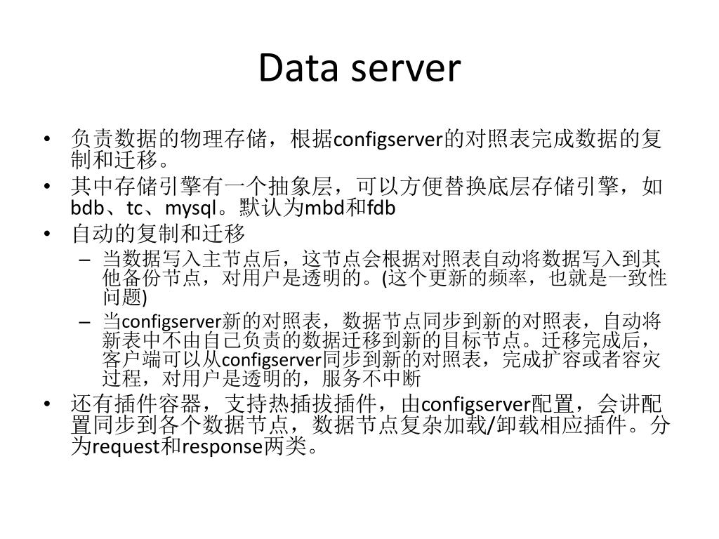 Data server • 负责数据的物理存储,根据configserver的对照表完成数据的复制和迁移。 • 其中存储引擎有一个抽象层,可以方便替换底层存储引擎,如bdb、tc、mysql。默认为mbd和fdb • 自动的复制和迁移 • 当数据写入主节点后,这节点会根据对照表自动将数据写入到其他备份节点,对用户是透明的。(这个更新的频率,也就是一致性问题) • 当configserver新的对照表,数据节点同步到新的对照表,自动将新表中不由自己负责的数据迁移到新的目标节点。迁移完成后,客户端可以从configserver同步到新的对照表,完成扩容或者容灾过程,对用户是透明的,服务不中断 • 还有插件容器,支持热插拔插件,由configserver配置,会讲配置同步到各个数据节点,数据节点复杂加载/卸载相应插件。分为request和response两类。