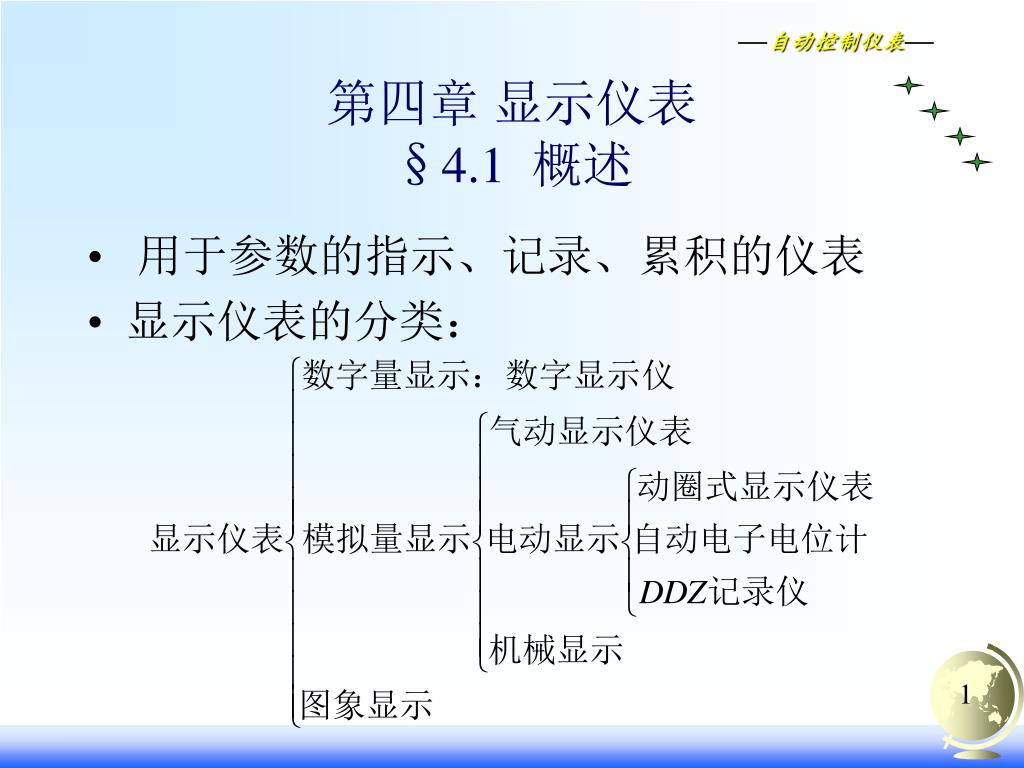 第四章 显示仪表§4.1 概述 • 用于参数的指示、记录、累积的仪表 • 显示仪表的分类: