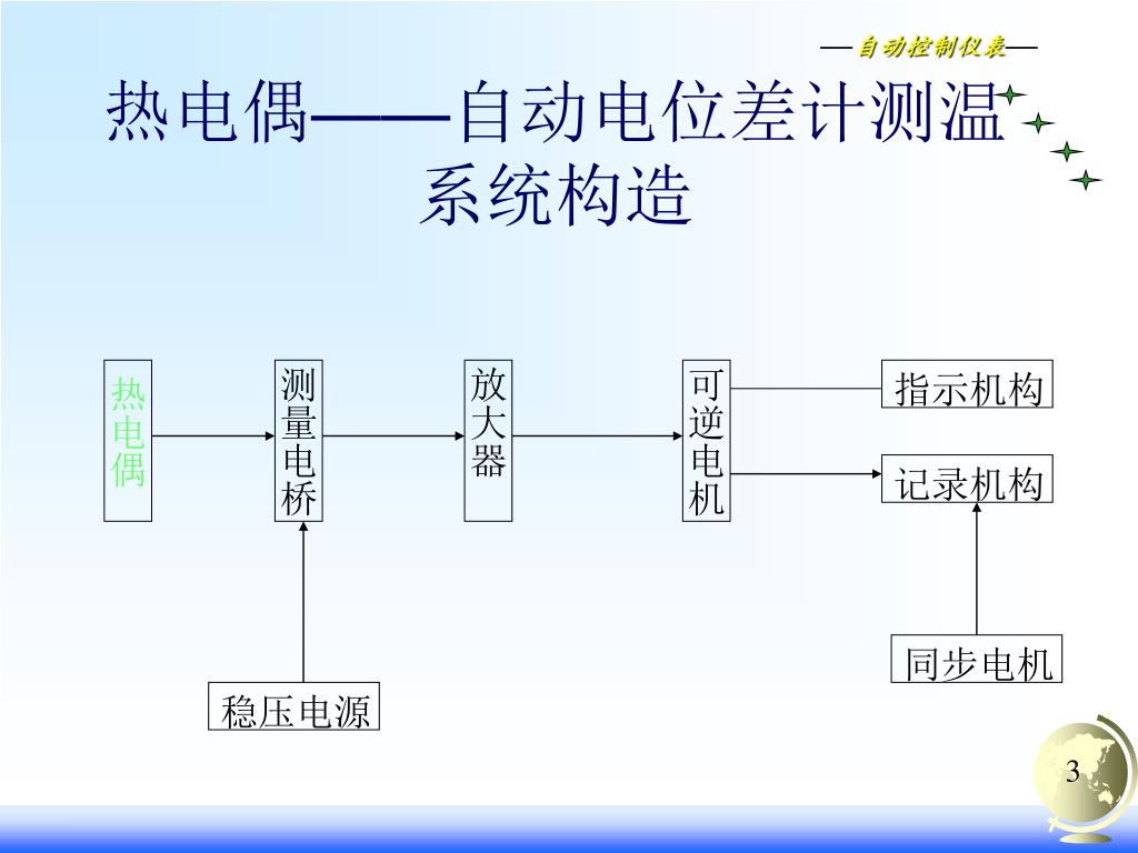 热电偶——自动电位差计测温系统构造 测量电桥 放大器 可逆电机 指示机构 热电偶 记录机构 同步电机 稳压电源