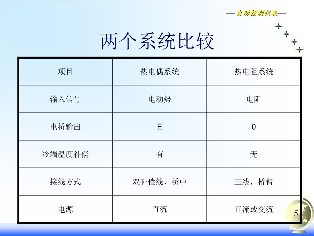 热电阻——自动电位差计测温系统 RT R R R 测量电桥 放大器 可逆电机 指示机构 热电阻 记录机构 同步电机 稳压电源