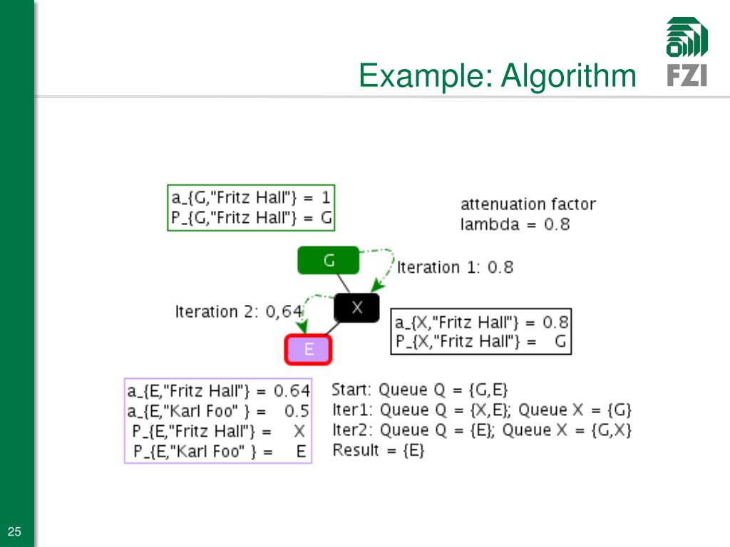 Algorithm Step 3 & 4Search for Steiner Graph & Ranking • Ranking • The connector represents the node with the final aggregation of references for each entity identifier • Topk is calculated by the connector activations • Further details are threshold factors, back propagation, assertion updates Joachim = 0,8 FZI = 0,21 2.01 J1 A3 A F1 A1 Joachim = 0,64 FZI = 0,17 Andreas = 0,13 1,94 F2