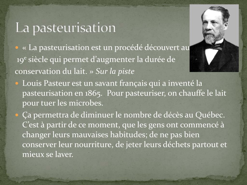 La pasteurisation • « La pasteurisation est un procédé découvert au 19e siècle qui permet d’augmenter la durée de conservation du lait. » Sur la piste • Louis Pasteur est un savant français qui a inventé la pasteurisation en 1865. Pour pasteuriser, on chauffe le lait pour tuer les microbes. • Ça permettra de diminuer le nombre de décès au Québec. C’est à partir de ce moment, que les gens ont commencé à changer leurs mauvaises habitudes; de ne pas bien conserver leur nourriture, de jeter leurs déchets partout et mieux se laver.