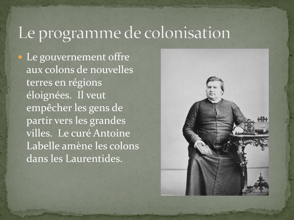 Le programme de colonisation • Le gouvernement offre aux colons de nouvelles terres en régions éloignées. Il veut empêcher les gens de partir vers les grandes villes. Le curé Antoine Labelle amène les colons dans les Laurentides.