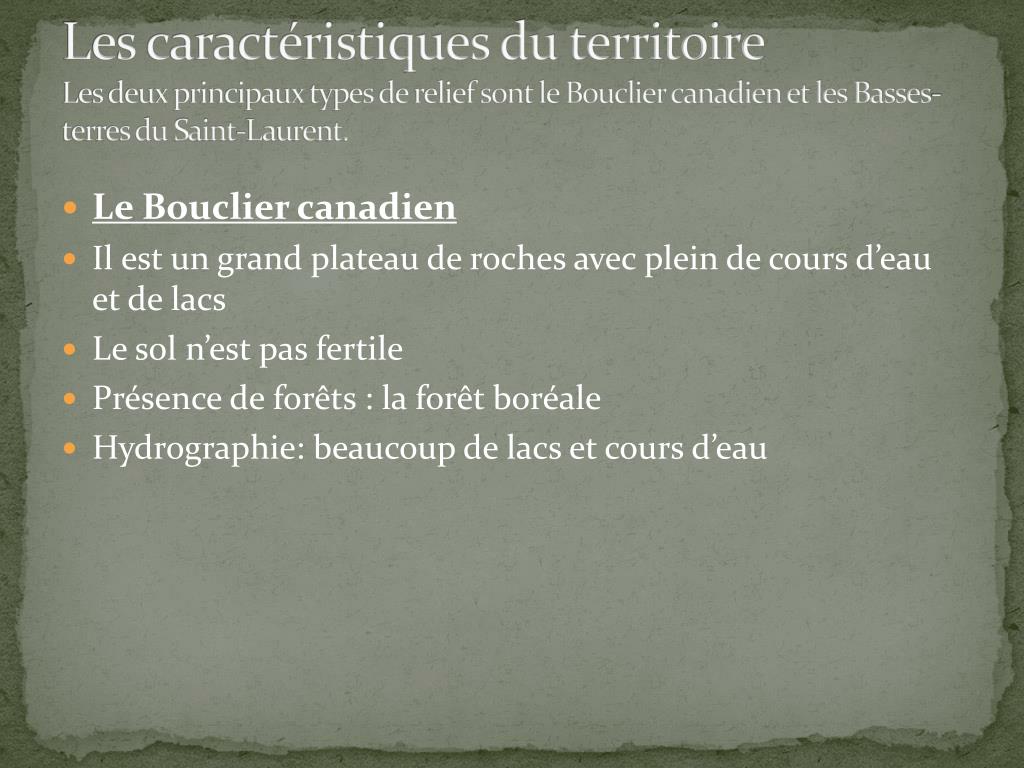 Les caractéristiques du territoireLes deux principaux types de relief sont le Bouclier canadien et les Basses-terres du Saint-Laurent. • Le Bouclier canadien • Il est un grand plateau de roches avec plein de cours d’eau et de lacs • Le sol n’est pas fertile • Présence de forêts : la forêt boréale • Hydrographie: beaucoup de lacs et cours d’eau