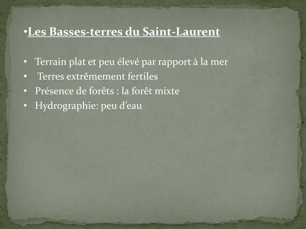 Les Basses-terres du Saint-Laurent • Terrain plat et peu élevé par rapport à la mer • Terres extrêmement fertiles • Présence de forêts : la forêt mixte • Hydrographie: peu d’eau