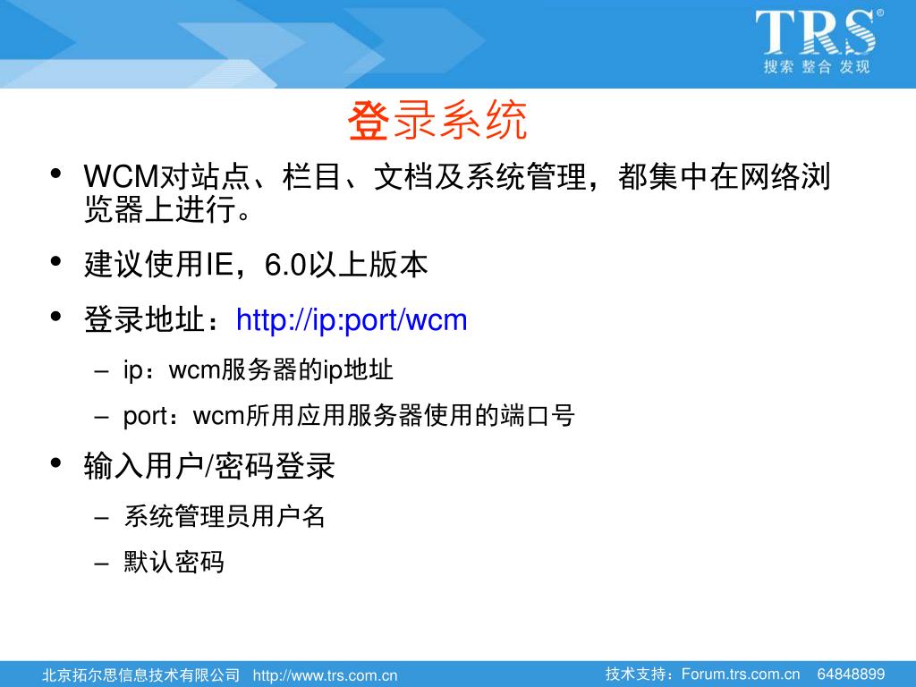 登录系统 • WCM对站点、栏目、文档及系统管理,都集中在网络浏览器上进行。 • 建议使用IE,6.0以上版本 • 登录地址:http://ip:port/wcm • ip:wcm服务器的ip地址 • port:wcm所用应用服务器使用的端口号 • 输入用户/密码登录 • 系统管理员用户名 • 默认密码