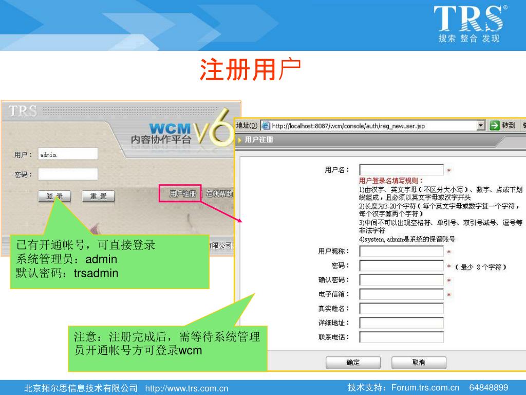 注册用户 已有开通帐号,可直接登录 系统管理员:admin 默认密码:trsadmin 注意:注册完成后,需等待系统管理员开通帐号方可登录wcm