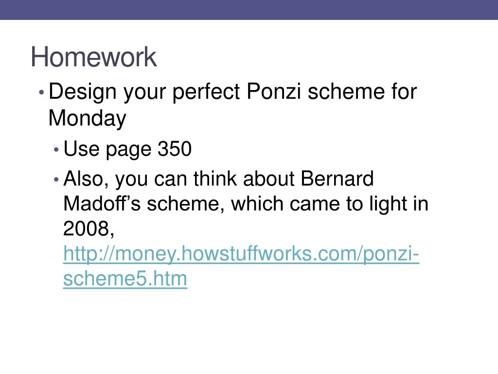 Design your perfect Ponzi scheme for Monday • Use page 350 • Also, you can think about Bernard Madoff’s scheme, which came to light in 2008, http://money.howstuffworks.com/ponzi-scheme5.htm Homework