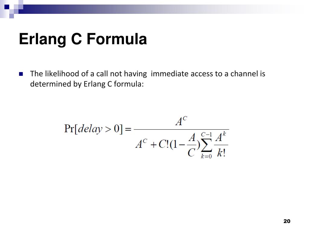 Erlang C Formula The likelihood of a call not having immediate access to a channel is determined by Erlang C formula: