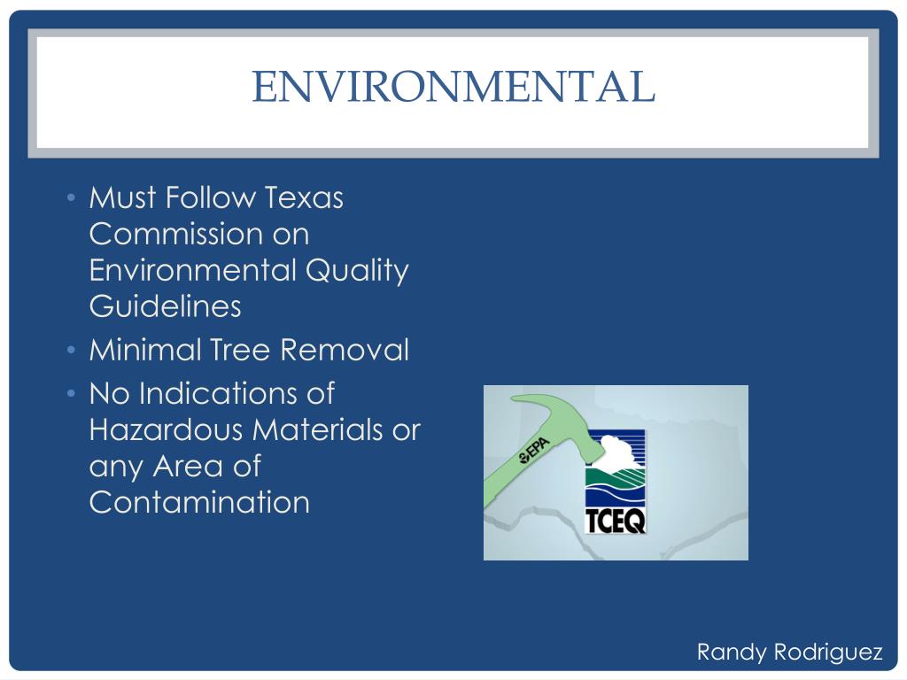 ENVIRONMENTAL • Must Follow Texas Commission on Environmental Quality Guidelines • Minimal Tree Removal • No Indications of Hazardous Materials or any Area of Contamination Randy Rodriguez
