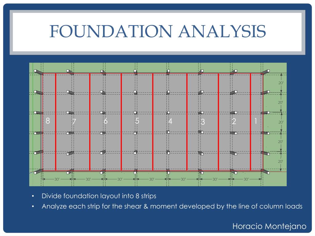 FOUNDATION ANALYSIS 8 6 5 4 1 2 7 3 • Divide foundation layout into 8 strips • Analyze each strip for the shear & moment developed by the line of column loads HoracioMontejano