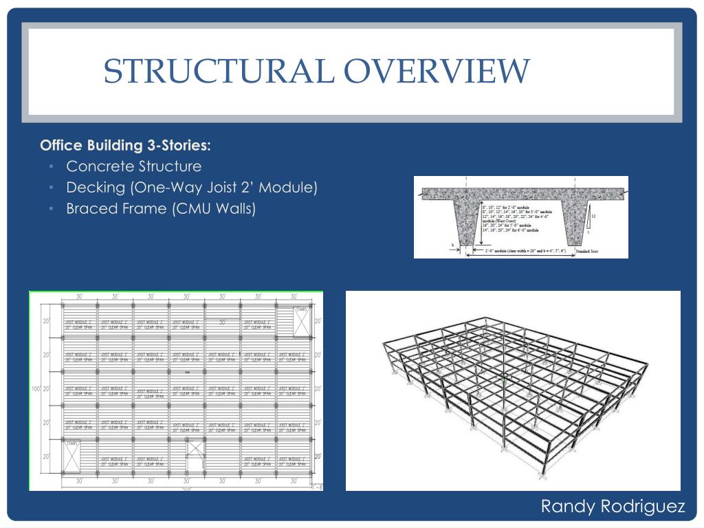Structural Overview Office Building 3-Stories: • Concrete Structure • Decking (One-Way Joist 2’ Module) • Braced Frame (CMU Walls) Randy Rodriguez