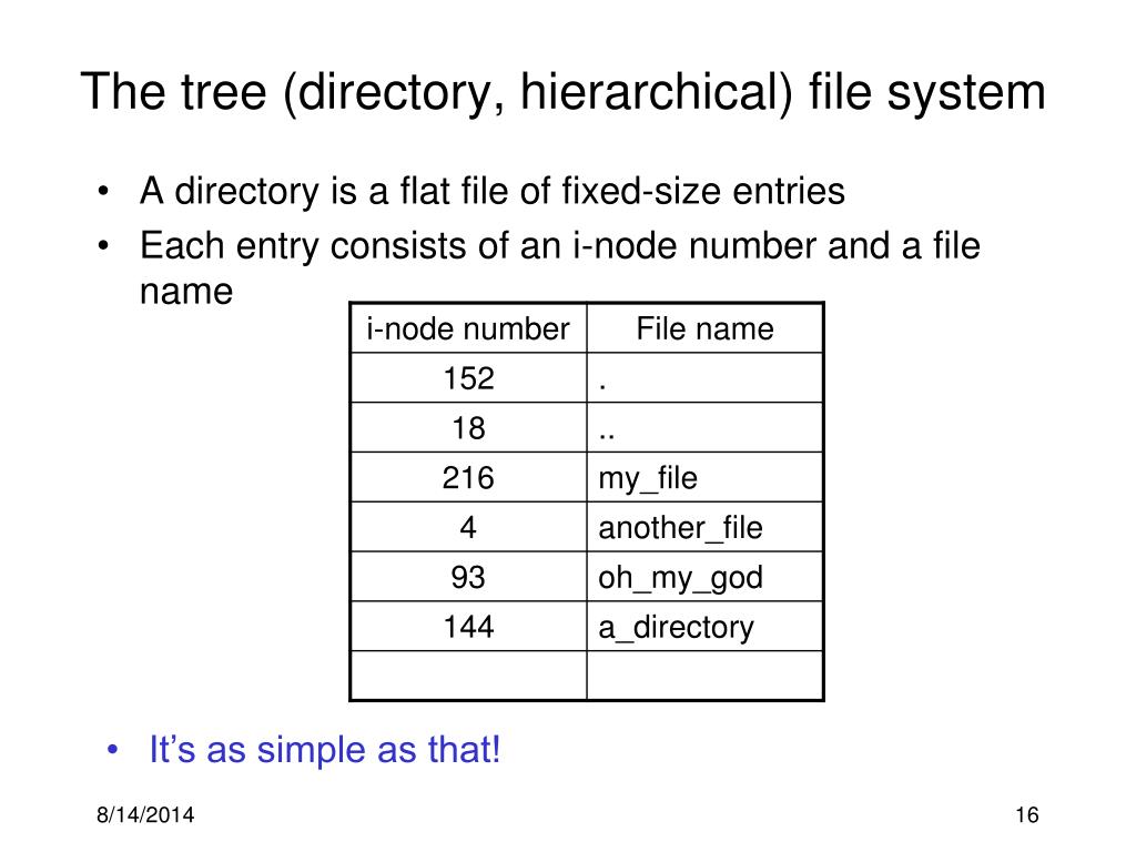 The tree (directory, hierarchical) file system • A directory is a flat file of fixed-size entries • Each entry consists of an i-node number and a file name • It’s as simple as that!