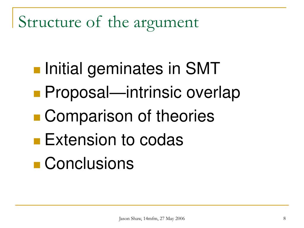 Structure of the argument • Initial geminates in SMT • Proposal—intrinsic overlap • Comparison of theories • Extension to codas • Conclusions Jason Shaw, 14mfm, 27 May 2006