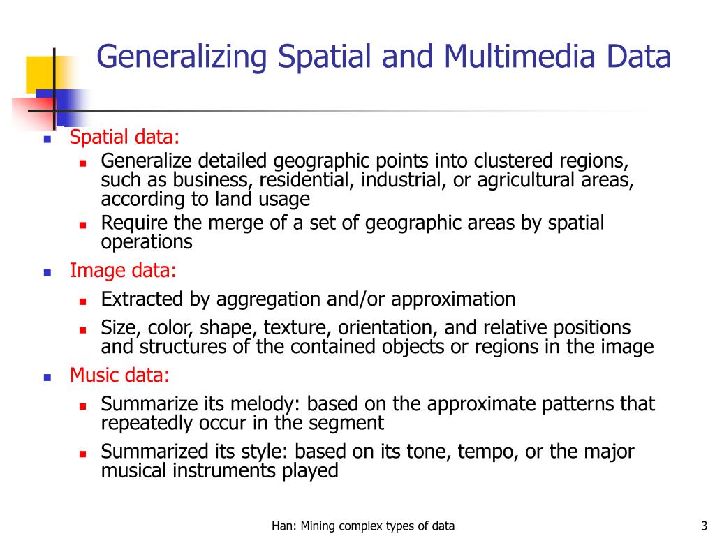 Chapter 9. Mining Complex Types of Data • Multidimensional analysis and descriptive mining of complex data objects • Mining spatial databases • Mining multimedia databases • Mining time-series and sequence data • Mining text databases • Mining the World-Wide Web • Summary Han: Mining complex types of data