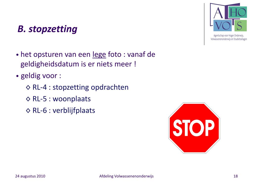 B. stopzetting •het opsturen van een lege foto : vanaf de geldigheidsdatum is er niets meer ! • geldig voor : ◊ RL-4 : stopzetting opdrachten ◊ RL-5 : woonplaats ◊ RL-6 : verblijfplaats Afdeling Volwassenenonderwijs