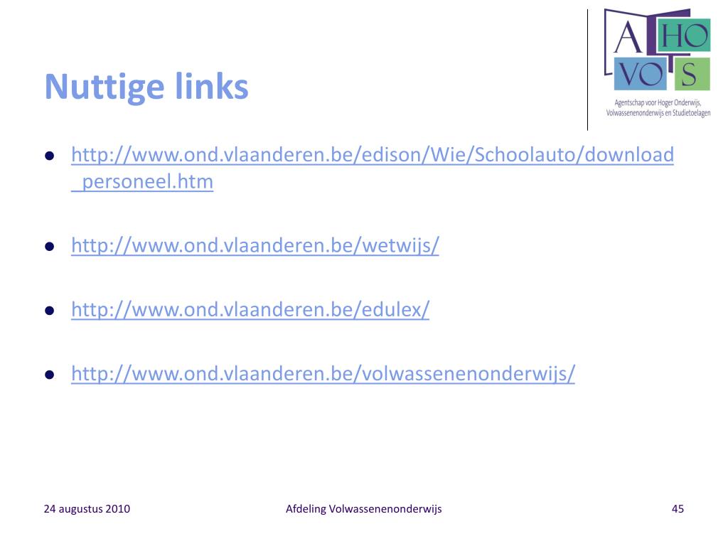Nuttige links • http://www.ond.vlaanderen.be/edison/Wie/Schoolauto/download_personeel.htm • http://www.ond.vlaanderen.be/wetwijs/ • http://www.ond.vlaanderen.be/edulex/ • http://www.ond.vlaanderen.be/volwassenenonderwijs/ Afdeling Volwassenenonderwijs
