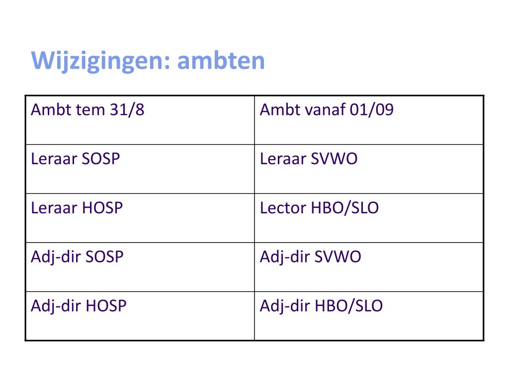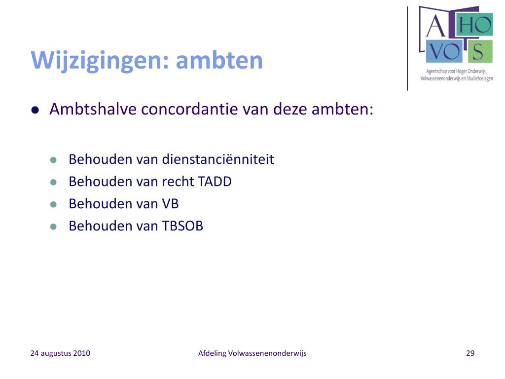 Wijzigingen: ambten • Ambtshalve concordantie van deze ambten: • Behouden van dienstanciënniteit • Behouden van recht TADD • Behouden van VB • Behouden van TBSOB Afdeling Volwassenenonderwijs