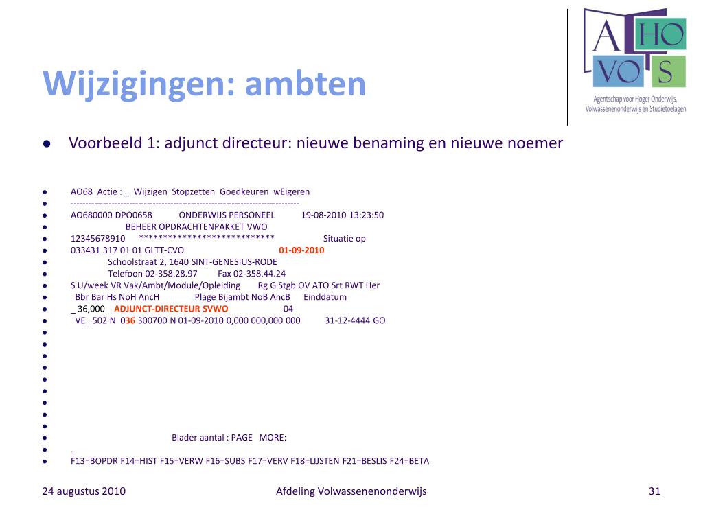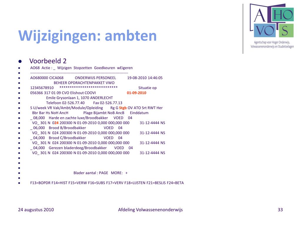 Wijzigingen: ambten • Voorbeeld 1: adjunct directeur: nieuwe benaming en nieuwe noemer • AO68 Actie : _ Wijzigen Stopzetten Goedkeuren wEigeren • ------------------------------------------------------------------------------ • AO680000 DPO0658 ONDERWIJS PERSONEEL 19-08-2010 13:23:50 • BEHEER OPDRACHTENPAKKET VWO • 12345678910 **************************** Situatie op • 033431 317 01 01 GLTT-CVO 01-09-2010 • Schoolstraat 2, 1640 SINT-GENESIUS-RODE • Telefoon 02-358.28.97 Fax 02-358.44.24 • S U/week VR Vak/Ambt/Module/Opleiding Rg G Stgb OV ATO Srt RWT Her • Bbr Bar Hs NoH AncH Plage Bijambt NoB AncB Einddatum • _ 36,000 ADJUNCT-DIRECTEURSVWO 04 • VE_ 502 N 036 300700 N 01-09-2010 0,000 000,000 000 31-12-4444 GO • Blader aantal : PAGE MORE: • . • F13=BOPDR F14=HIST F15=VERW F16=SUBS F17=VERV F18=LIJSTEN F21=BESLIS F24=BETA Afdeling Volwassenenonderwijs