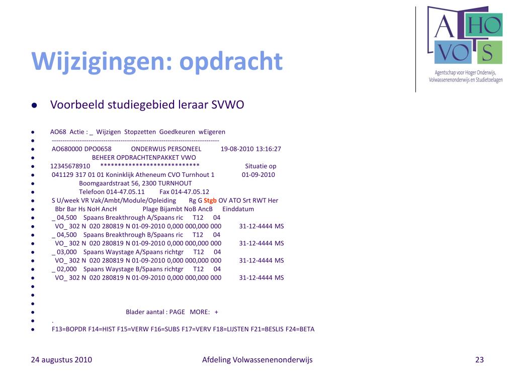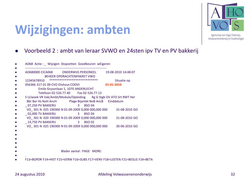 Wijzigingen: ambten • Voorbeeld 2 : ambt van leraar SVWO en 24sten ipv TV en PV bakkerij • AO68 Actie : _ Wijzigen Stopzetten Goedkeuren wEigeren • ------------------------------------------------------------------------------ • AO680000 CICA068 ONDERWIJS PERSONEEL 19-08-2010 14:48:07 • BEHEER OPDRACHTENPAKKET VWO • 12345678910 **************************** Situatie op • 056366 317 01 09 CVO Elishout COOVI 01-01-2010 • Emile Grysonlaan 1, 1070 ANDERLECHT • Telefoon 02-526.77.40 Fax 02-526.77.13 • S U/week VR Vak/Ambt/Module/Opleiding Rg G Stgb OV ATO Srt RWT Her • Bbr Bar Hs NoH AncH Plage Bijambt NoB AncB Einddatum • _ 07,250 PV BAKKERIJ 3 BSO 04 • VO_ 301 N 025 190300 N 01-09-2009 0,000 000,000 000 31-08-2010 GO • _ 02,000 TV BAKKERIJ 3 BSO 04 • VO_ 301 N 020 190300 N 01-09-2009 0,000 000,000 000 31-08-2010 GO • _ 14,750 PV BAKKERIJ 3 BSO 02 • VO_ 301 N 025 190300 N 01-09-2009 0,000 000,000 000 30-06-2010 GO • Blader aantal : PAGE MORE: • . • F13=BOPDR F14=HIST F15=VERW F16=SUBS F17=VERV F18=LIJSTEN F21=BESLIS F24=BETA Afdeling Volwassenenonderwijs