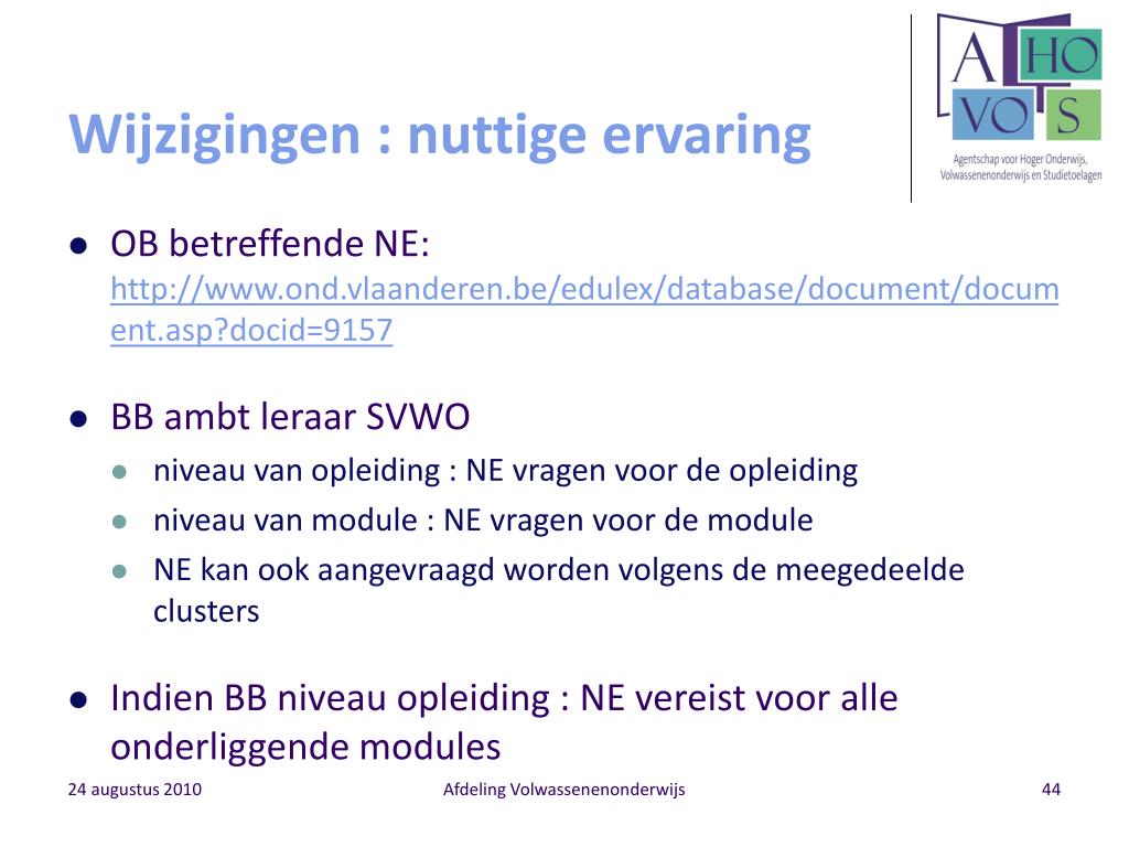 Wijzigingen : nuttige ervaring • OB betreffende NE:http://www.ond.vlaanderen.be/edulex/database/document/document.asp?docid=9157 • BB ambt leraar SVWO • niveau van opleiding : NE vragen voor de opleiding • niveau van module : NE vragen voor de module • NE kan ook aangevraagd worden volgens de meegedeelde clusters • Indien BB niveau opleiding : NE vereist voor alle onderliggende modules Afdeling Volwassenenonderwijs