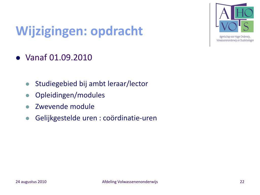 Wijzigingen: opdracht • Vanaf01.09.2010 • Studiegebied bij ambt leraar/lector • Opleidingen/modules • Zwevende module • Gelijkgestelde uren : coördinatie-uren Afdeling Volwassenenonderwijs