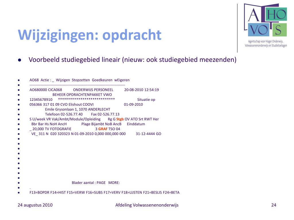 Wijzigingen: opdracht • Voorbeeld studiegebied lineair (nieuw: ook studiegebied meezenden) • AO68 Actie : _ Wijzigen Stopzetten Goedkeuren wEigeren • ------------------------------------------------------------------------------ • AO680000 CICA068 ONDERWIJS PERSONEEL 20-08-2010 12:54:19 • BEHEER OPDRACHTENPAKKET VWO • 12345678910 **************************** Situatie op • 056366 317 01 09 CVO Elishout COOVI 01-09-2010 • Emile Grysonlaan 1, 1070 ANDERLECHT • Telefoon 02-526.77.40 Fax 02-526.77.13 • S U/week VR Vak/Ambt/Module/Opleiding Rg G StgbOV ATO Srt RWT Her • Bbr Bar Hs NoH AncH Plage Bijambt NoB AncB Einddatum • _ 20,000 TV FOTOGRAFIE 3 GRAFTSO 04 • VE_ 311 N 020 320323 N 01-09-2010 0,000 000,000 000 31-12-4444 GO • Blader aantal : PAGE MORE: • . • F13=BOPDR F14=HIST F15=VERW F16=SUBS F17=VERV F18=LIJSTEN F21=BESLIS F24=BETA Afdeling Volwassenenonderwijs