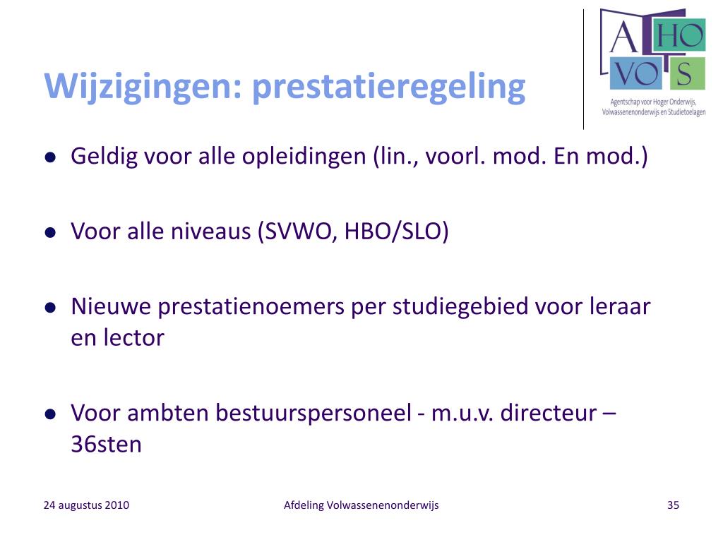 Wijzigingen: prestatieregeling • Geldig voor alle opleidingen (lin., voorl. mod. En mod.) • Voor alle niveaus (SVWO, HBO/SLO) • Nieuwe prestatienoemers per studiegebied voor leraar en lector • Voor ambten bestuurspersoneel - m.u.v. directeur – 36sten Afdeling Volwassenenonderwijs