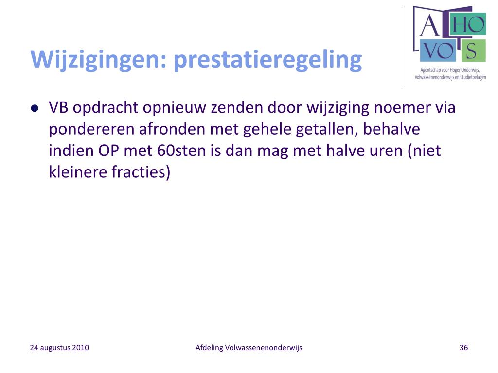 Wijzigingen: prestatieregeling • VB opdracht opnieuw zenden door wijziging noemer via pondereren afronden met gehele getallen, behalve indien OP met 60sten is dan mag met halve uren (niet kleinere fracties) Afdeling Volwassenenonderwijs