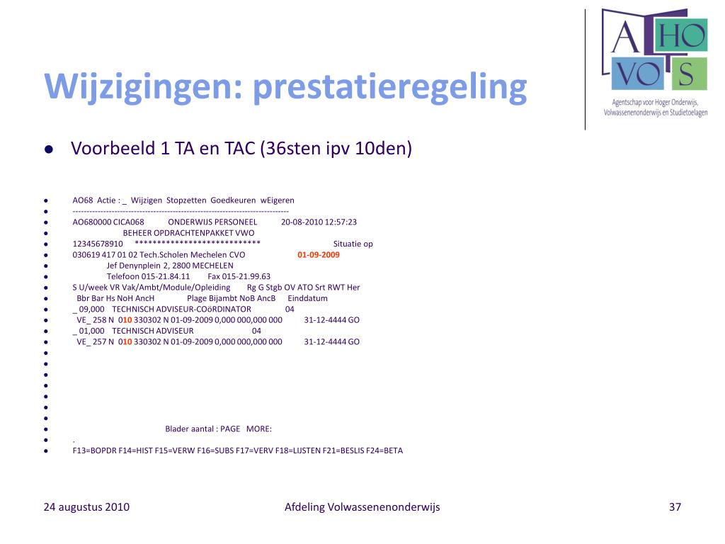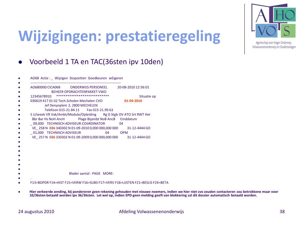 Wijzigingen: prestatieregeling • Voorbeeld 1 TA en TAC(36sten ipv 10den) • AO68 Actie : _ Wijzigen Stopzetten Goedkeuren wEigeren • ------------------------------------------------------------------------------ • AO680000 CICA068 ONDERWIJS PERSONEEL 20-08-2010 12:56:01 • BEHEER OPDRACHTENPAKKET VWO • 12345678910 **************************** Situatie op • 030619 417 01 02 Tech.Scholen Mechelen CVO 01-09-2010 • Jef Denynplein 2, 2800 MECHELEN • Telefoon 015-21.84.11 Fax 015-21.99.63 • S U/week VR Vak/Ambt/Module/Opleiding Rg G Stgb OV ATO Srt RWT Her • Bbr Bar Hs NoH AncH Plage Bijambt NoB AncB Einddatum • _ 09,000 TECHNISCH ADVISEUR-COöRDINATOR 04 • VE_ 258 N 036 340302 N 01-09-2010 0,000 000,000 000 31-12-4444 GO • _ 01,000 TECHNISCH ADVISEUR 04 OPM • VE_ 257 N 036 330302 N 01-09-2009 0,000 000,000 000 31-12-4444 GO • Blader aantal : PAGE MORE: • . • F13=BOPDR F14=HIST F15=VERW F16=SUBS F17=VERV F18=LIJSTEN F21=BESLIS F24=BETA • Hier verkeerde zending, bij pondereren geen rekening gehouden met nieuwe noemers, indien we hier niet cvo zouden contacteren zou betrokkene maar voor 10/36sten betaald worden ipv 36/36sten. Let wel op, indien EPD geen melding geeft van blokkering zal dit dossier automatisch betaald worden. Afdeling Volwassenenonderwijs