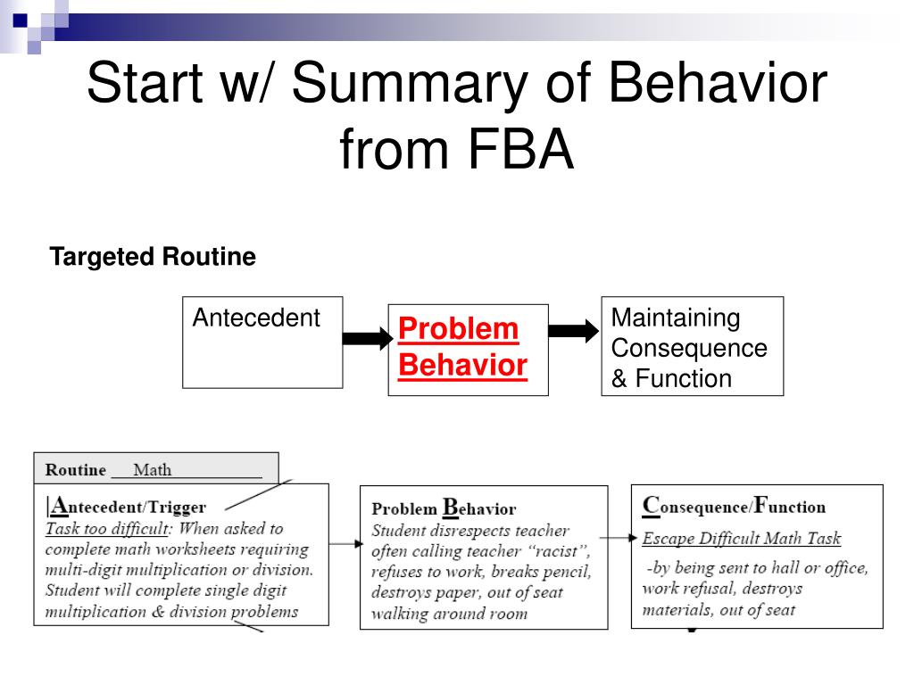 Start w/ Summary of Behavior from FBA Targeted Routine Antecedent Maintaining Consequence & Function Problem Behavior