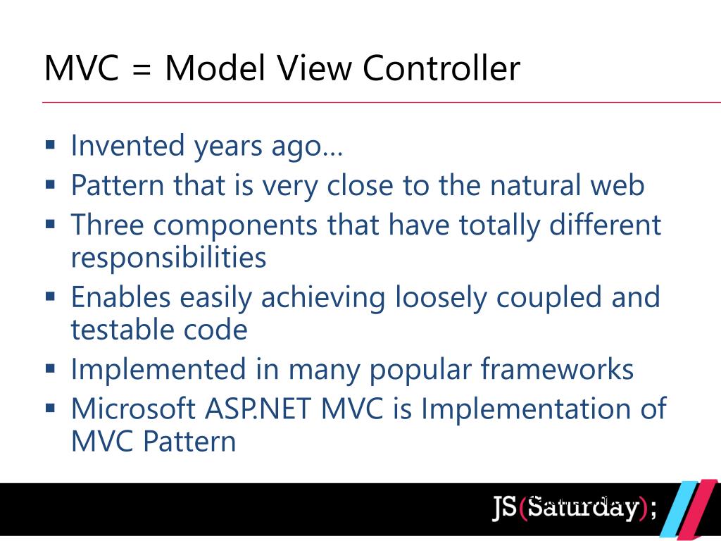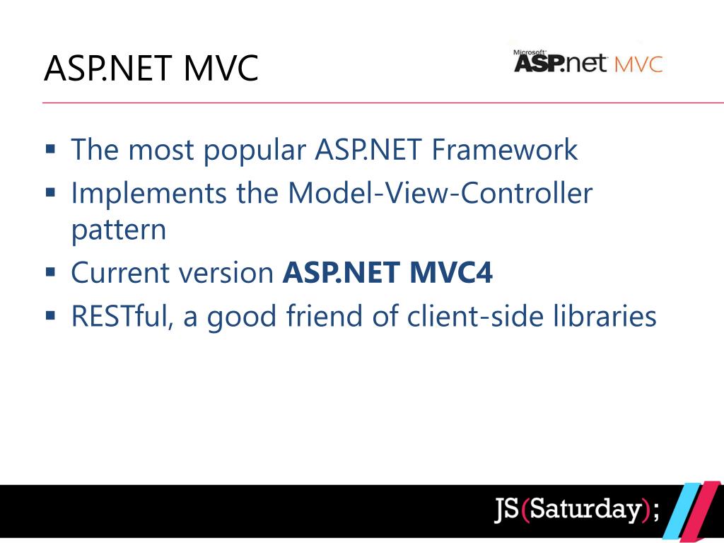 ASP.NET MVC • The most popular ASP.NET Framework • Implements the Model-View-Controller pattern • Current version ASP.NET MVC4 • RESTful, a good friend of client-side libraries