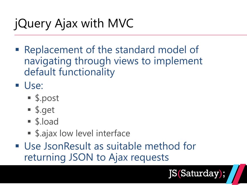 jQuery Ajax with MVC • Replacement of the standard model of navigating through views to implement default functionality • Use: • $.post • $.get • $.load • $.ajax low level interface • Use JsonResult as suitable method for returning JSON to Ajax requests