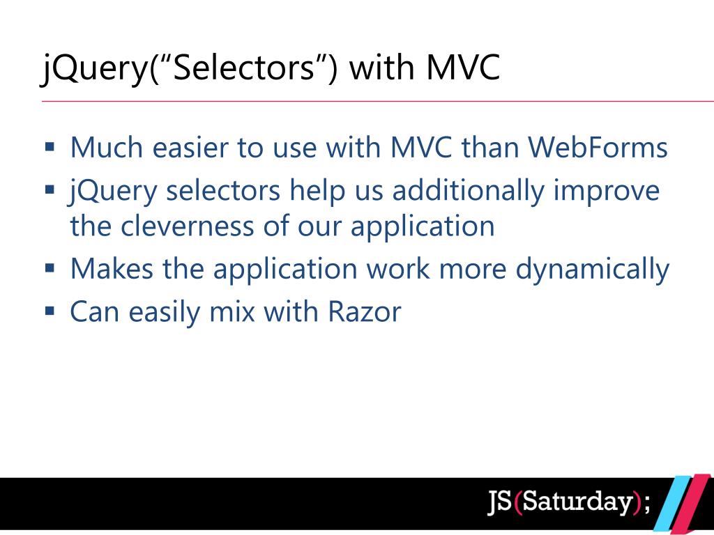 jQuery(“Selectors”) with MVC • Much easier to use with MVC than WebForms • jQuery selectors help us additionally improve the cleverness of our application • Makes the application work more dynamically • Can easily mix with Razor