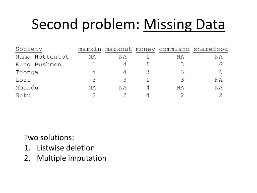 Second problem: Missing Data Societymarkinmarkoutmoneycommlandsharefood NamaHottentot NA NA 1 NA NA Kung Bushmen 1 4 1 3 6 Thonga 4 4 3 3 6 Lozi 3 3 1 3 NA Mbundu NA NA 4 NA NA Suku 2 2 4 2 2 Two solutions: Listwise deletion Multiple imputation
