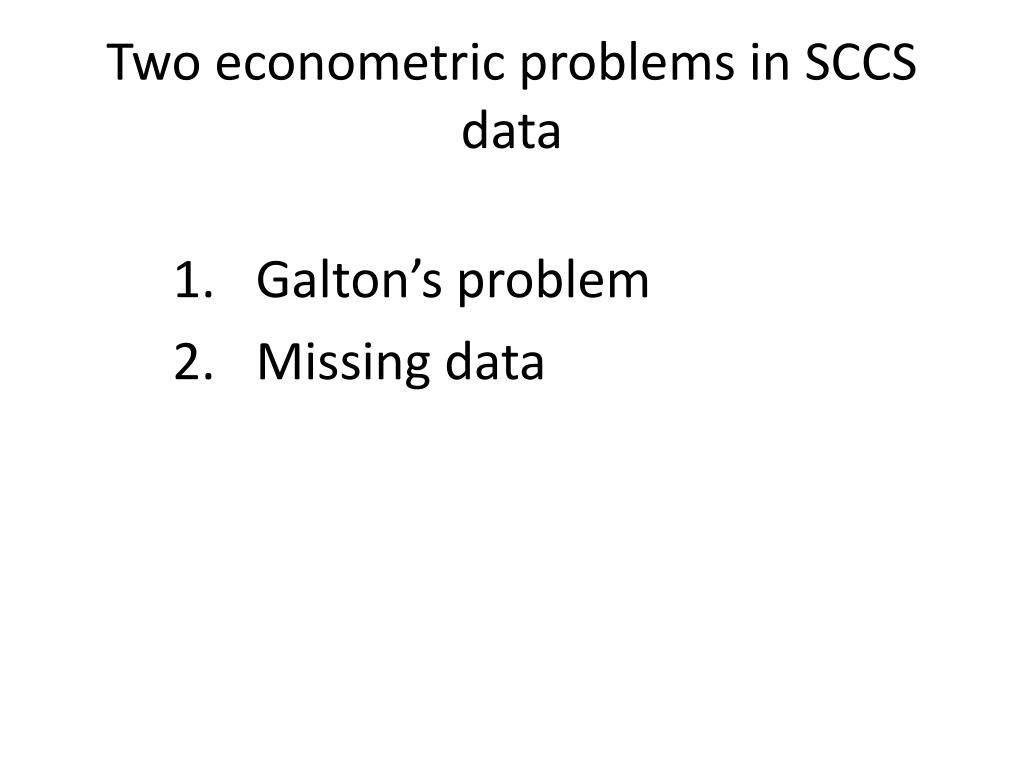 First problem: Galton’s problem Observations not independent. • Common descent (language phylogeny) • Cultural borrowing (geographic distance) In regression context, Galton’s problem will cause biased coefficients and biased standard errors.