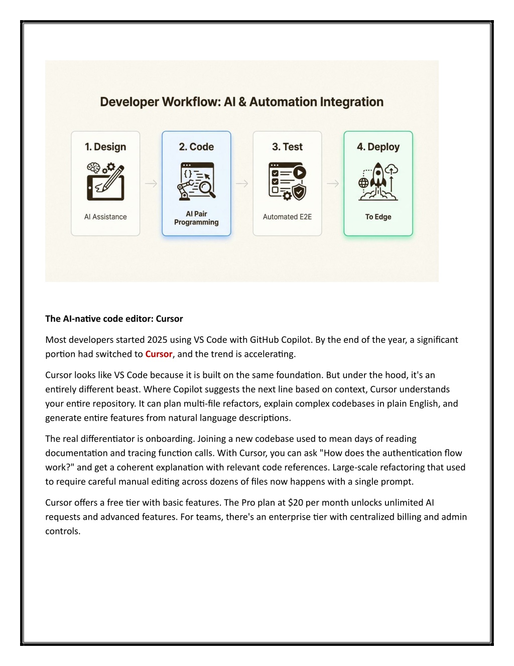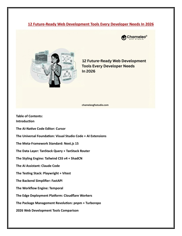 12 Future-Ready Web Development Tools Every Developer Needs In 2026 Table of Contents: Introduction The AI-Native Code Editor: Cursor The Universal Foundation: Visual Studio Code + AI Extensions The Meta-Framework Standard: Next.js 15 The Data Layer: TanStack Query + TanStack Router The Styling Engine: Tailwind CSS v4 + ShadCN The AI Assistant: Claude Code The Testing Stack: Playwright + Vitest The Backend Simplifier: FastAPI The Workflow Engine: Temporal The Edge Deployment Platform: Cloudflare Workers The Package Management Revolution: pnpm + Turborepo 2026 Web Development Tools Comparison