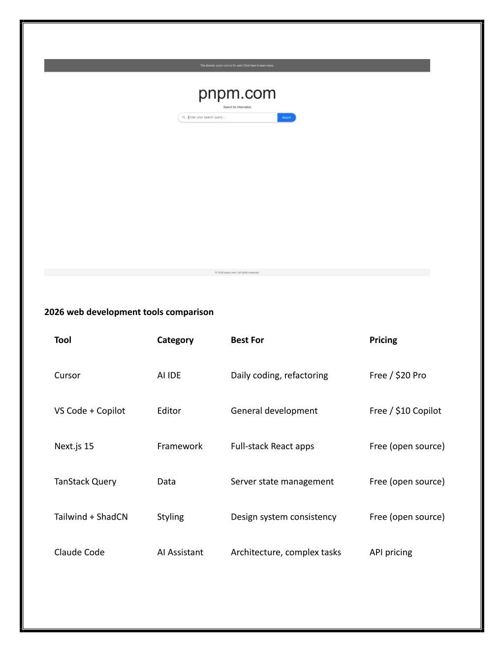2026 web development tools comparison Tool Category Best For Pricing Cursor AI IDE Daily coding, refactoring Free / $20 Pro VS Code+ Copilot Editor General development Free / $10 Copilot Next.js 15 Framework Full-stack React apps Free (open source) TanStack Query Data Server state management Free (open source) Tailwind+ShadCN Styling Design system consistency Free (open source) Claude Code AI Assistant Architecture, complex tasks API pricing