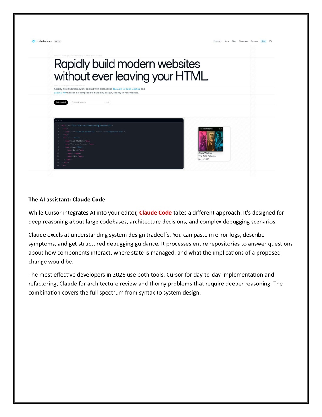 The AI assistant:Claude Code While Cursor integrates AI into your editor,Claude Codetakes a different approach. It's designed for deep reasoning about large codebases, architecture decisions, and complex debugging scenarios. Claude excels at understanding system design tradeoffs. You can paste in error logs, describe symptoms, and get structured debugging guidance. It processes entire repositories to answer questions about how components interact, where state is managed, and what the implications of a proposed change would be. The most effective developers in 2026 use both tools: Cursor for day-to-day implementation and refactoring, Claude for architecture review and thorny problems that require deeper reasoning. The combination covers the full spectrum from syntax to system design.