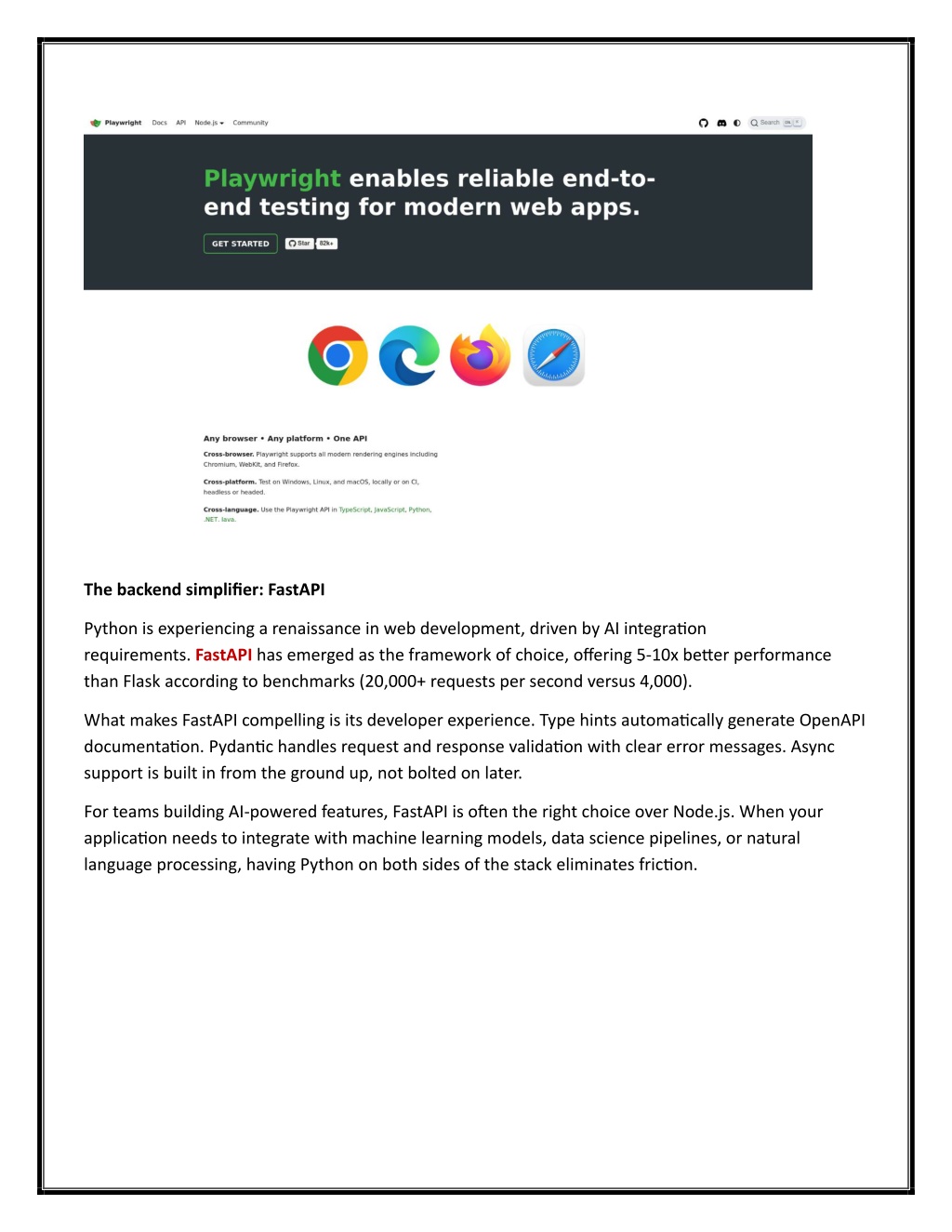 The backend simplifier:FastAPI Python is experiencing a renaissance in web development, driven by AI integration requirements.FastAPIhas emerged as the framework of choice, offering 5-10x better performance than Flask according to benchmarks (20,000+ requests per second versus 4,000). What makes FastAPI compelling is its developer experience. Type hints automatically generate OpenAPI documentation. Pydantic handles request and response validation with clear error messages. Async support is built in from the ground up, not bolted on later. For teams building AI-powered features, FastAPI is often the right choice over Node.js. When your application needs to integrate with machine learning models, data science pipelines, or natural language processing, having Python on both sides of the stack eliminates friction.