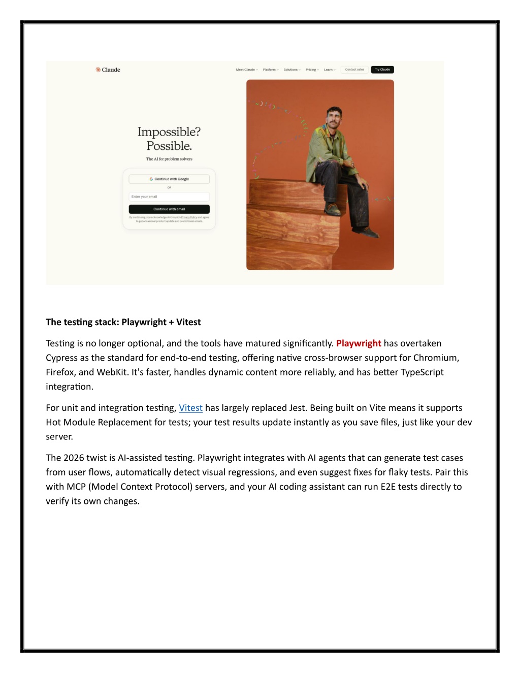The testing stack:Playwright+Vitest Testing is no longer optional, and the tools have matured significantly.Playwrighthas overtaken Cypress as the standard for end-to-end testing, offering native cross-browser support for Chromium, Firefox, and WebKit. It's faster, handles dynamic content more reliably, and has better TypeScript integration. For unit and integration testing,Vitesthas largely replaced Jest. Being built on Vite means it supports Hot Module Replacement for tests; your test results update instantly as you save files, just like your dev server. The 2026 twist is AI-assisted testing. Playwright integrates with AI agents that can generate test cases from user flows, automatically detect visual regressions, and even suggest fixes for flaky tests. Pair this with MCP (Model Context Protocol) servers, and your AI coding assistant can run E2E tests directly to verify its own changes.