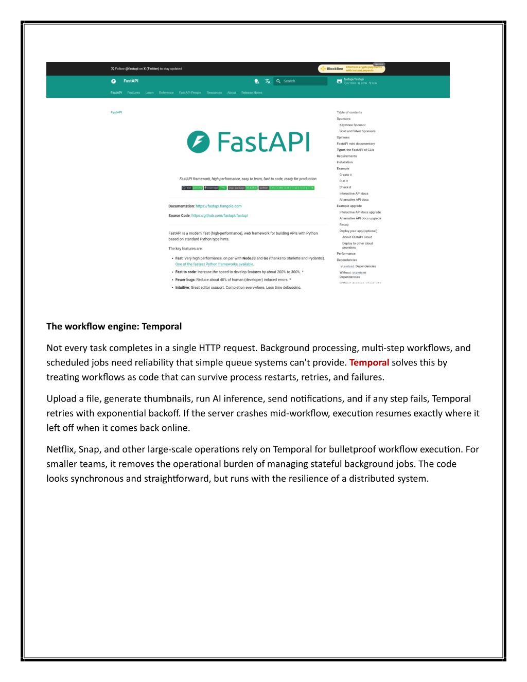 The workflow engine:Temporal Not every task completes in a single HTTP request. Background processing, multi-step workflows, and scheduled jobs need reliability that simple queue systems can't provide.Temporalsolves this by treating workflows as code that can survive process restarts, retries, and failures. Upload a file, generate thumbnails, run AI inference, send notifications, and if any step fails, Temporal retries with exponential backoff. If the server crashes mid-workflow, execution resumes exactly where it left off when it comes back online. Netflix, Snap, and other large-scale operations rely on Temporal for bulletproof workflow execution. For smaller teams, it removes the operational burden of managing stateful background jobs. The code looks synchronous and straightforward, but runs with the resilience of a distributed system.