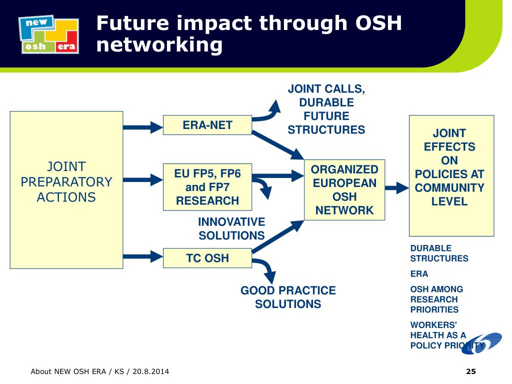 Future impact through OSH networking JOINT CALLS, DURABLE FUTURE STRUCTURES ERA-NET JOINT EFFECTS ON POLICIES AT COMMUNITY LEVEL JOINT PREPARATORY ACTIONS ORGANIZED EUROPEAN OSH NETWORK EU FP5, FP6 and FP7 RESEARCH INNOVATIVE SOLUTIONS DURABLE STRUCTURES ERA OSH AMONG RESEARCH PRIORITIES WORKERS' HEALTH AS A POLICY PRIORITY TC OSH GOOD PRACTICE SOLUTIONS About NEW OSH ERA / KS / 20.8.2014